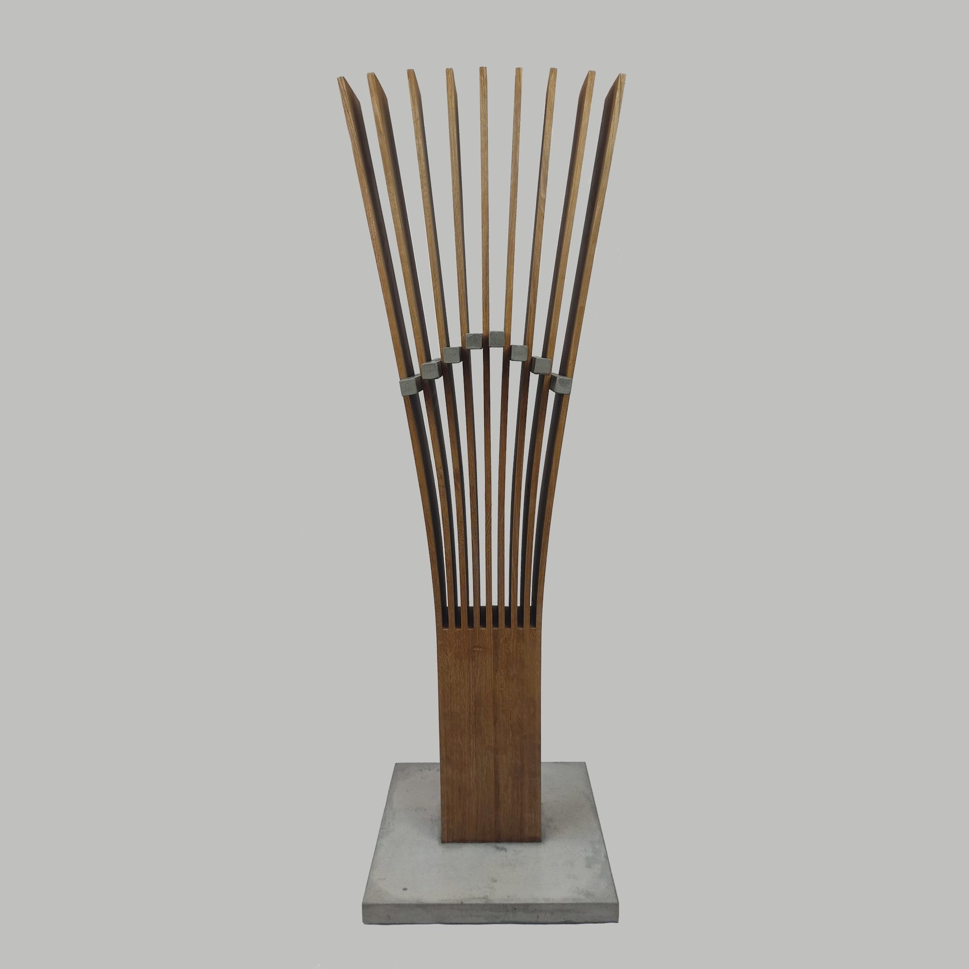 - Fächer-inspiriertes Design: Präzise geschnittener Eichenbalken und Betondistanzstücke schaffen eine skulpturale, visuell ansprechende Form