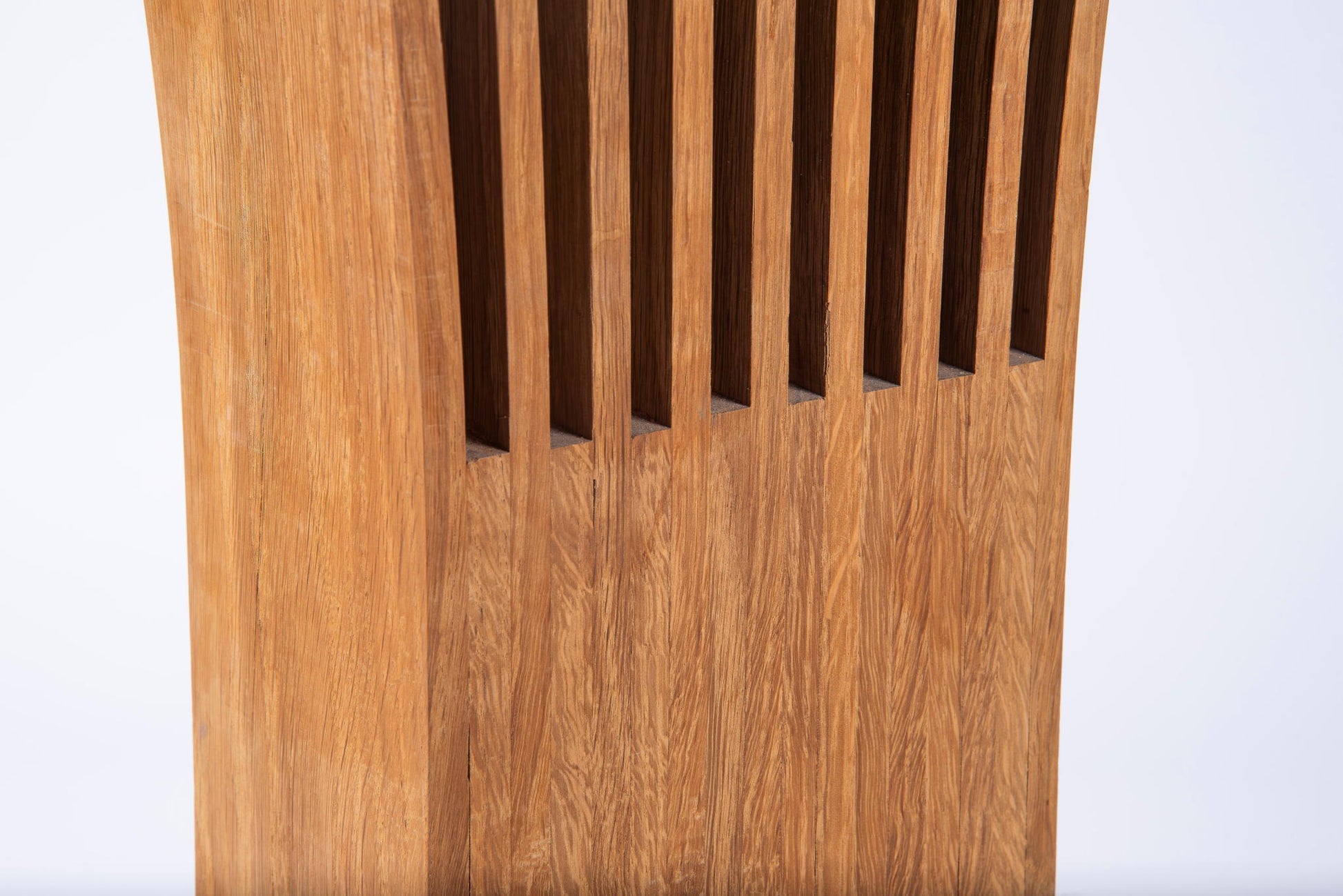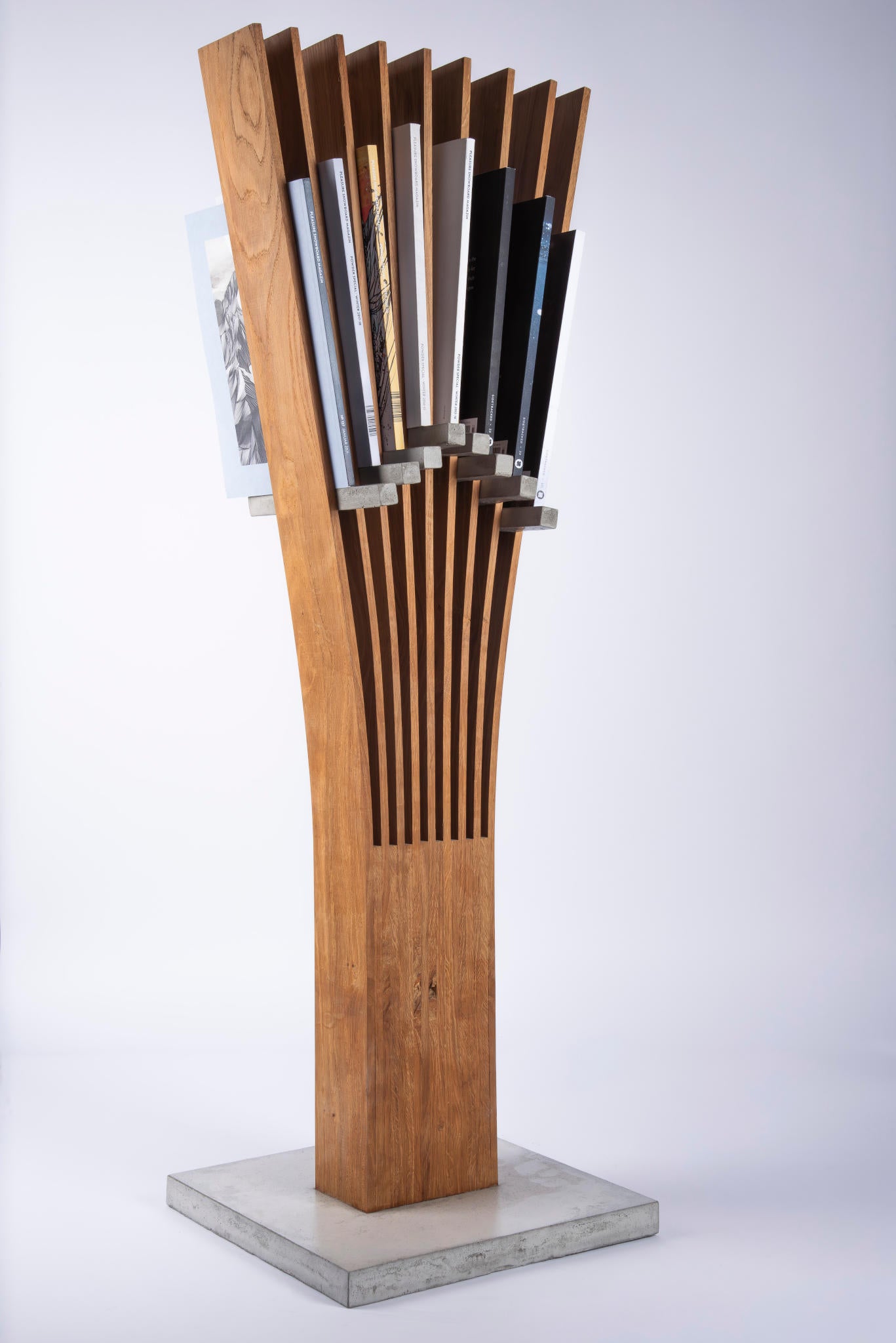 Inspired by the graceful spread of a hand fan, Read Beam reimagines media storage with striking architectural elegance. A robust concrete base anchors a single solid oak beam, precision-cut to create a dynamic, fanned-out silhouette. Eight concrete spacers separate the oak elements, providing dedicated slots not only for magazines, but also for vinyl records, tablets, documents, and more. The result is a bold, functional centerpiece that brings order and beauty to any modern or minimalist space.
